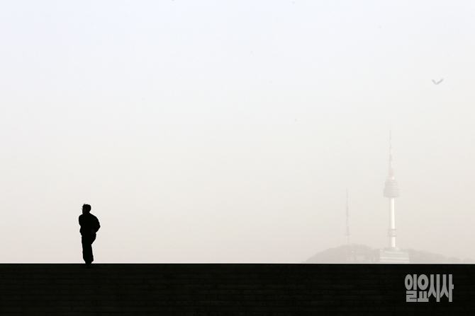 서울과 수도권 지역에 황사경보가 내려진 23일 오전 서울 용산구 국립중앙박물관에서 바라본 N서울타워가 뿌옇게 보이고 있다.