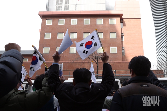 독도국민연대 회원들이 23일 오전 서울 종로구 중학동 일본대사관 앞에서 열린 일본의 '다케시마의 날' 행사를 비롯한 독도 도발을 규탄하는 기자회견에서 태극기를 휘날리고 있다.