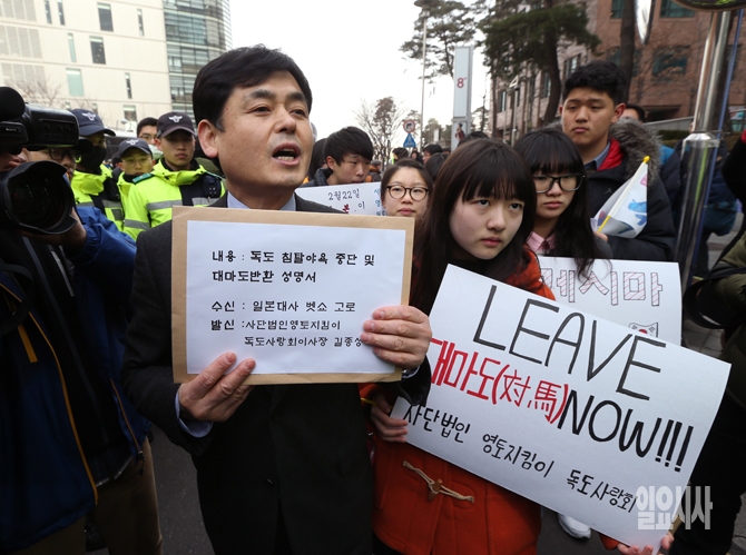 사단법인 영토지킴이 독도사랑회 회원들이 23일 오전 서울 종로구 일본대사관 앞에서 일본 시마네현의 '다케시마의 날' 기념행사 등 독도 도발을 규탄하며 대사관 측에 성명서를 제출하기 위해 이동하고 있다.