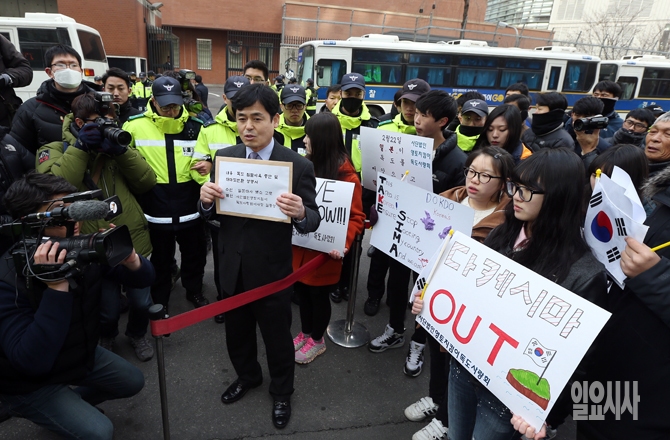 사단법인 영토지킴이 독도사랑회 회원들이 23일 오전 서울 종로구 일본대사관 앞에서 일본 시마네현의 '다케시마의 날' 기념행사 등 독도 도발을 규탄하며 대사관 측에 성명서를 제출하기 위해 이동하고 있다.