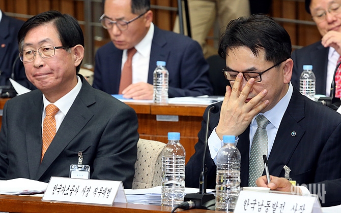 23일, 서울 여의도 국회에서 열린 해외자원개발 진상규명을 위한 국정조사특별위원회 도중 이종호 한국가스공사 사장 직무 대행이 안경을 올려 쓰고 있다.