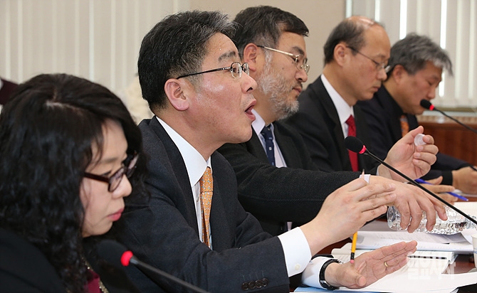 23일, 서울 여의도 국회 법제사법위원회 회의실에서 '부정청탁 및 금품 등 수수금지법 공청회'가 열리고 있는 가운데, 한국기자협회 박종률 회장이 진술인으로 출석해 발언하고 있다.