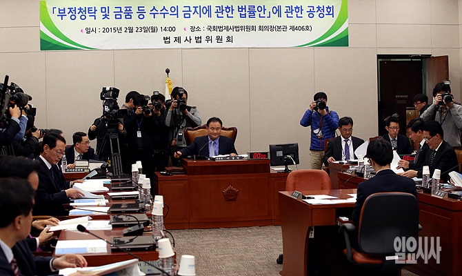 23일, 서울 여의도 국회 법제사법위원회 회의실에서 '부정청탁 및 금품 등 수수금지법 공청회'가 열리고 있는 가운데, 이상민 법사위원장이 개의를 알리는 의사봉을 두드리고 있다.