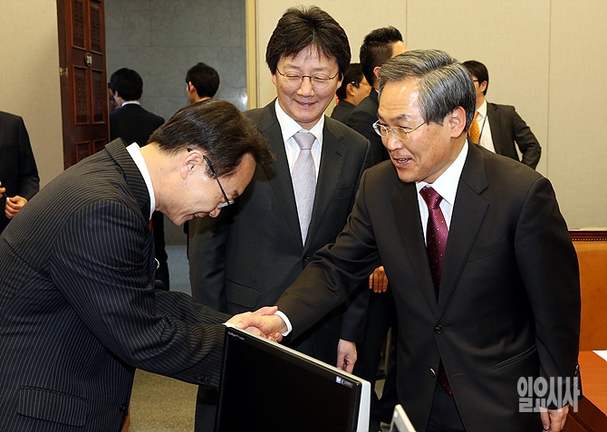 23일, 서울 여의도 국회 운영위원회 회의실에서 전체회의 직전, 새정치민주연합 우윤근 의원(원내대표, 사진 오른쪽)이 조해진 의원(새누리당 원내수석부대표)과 악수를 나누고 있다.