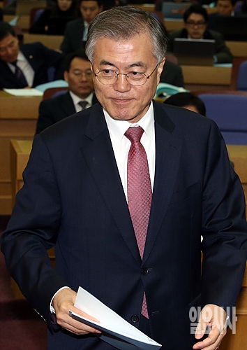 23일, 서울 여의도 국회 의원회관 소회의실에서 열린 '박근혜정부 2년 평가, 불통의 리더십, 무너진 민생경제' 토론회가 열린 가운데, 새정치민주연합 문재인 대표가 발언을 위해 단상으로 나가고 있다.