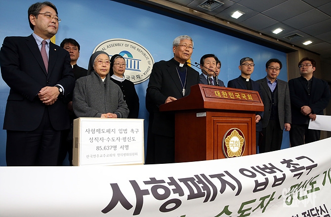 24일, 서울 여의도 국회 정론관에서 한 종교단체 종교인들이 한국 천주교 사제·수도자·평신도 85, 637명의 서명용지 국회 전달식을 갖으며 사형제 폐지를 촉구하고 있다.