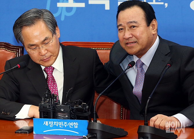 24일, 서울 여의도 국회 새정치민주연합 우윤근 원내대표(사진 왼쪽)를 찾은 이완구 국무총리가 반가움의 포옹을 나누고 있다.