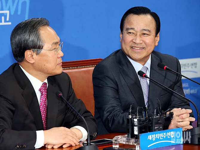24일, 서울 여의도 국회 새정치민주연합 우윤근 원내대표(사진 왼쪽)를 찾은 이완구 국무총리가 웃음 짓고 있다.