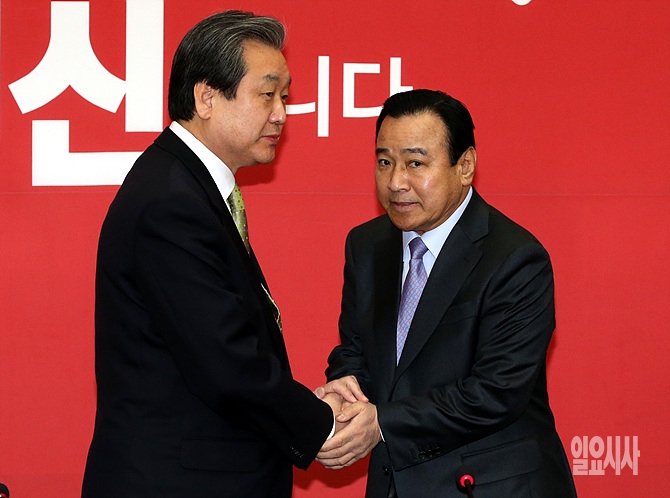 24일, 서울 여의도 국회 새누리당 김무성 대표(사진 왼쪽)를 예방한 이완구 총리가 김 대표와 악수를 나누고 있다.