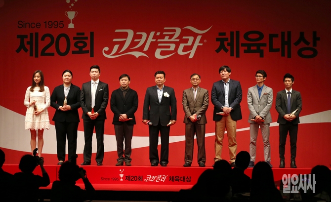 24일 오전 서울 중구 소공동 웨스틴조선호텔에서 열린 '제20회 코카콜라 체육대상 시상식'에서 역대 최우수선수상 수상자들이  기념 촬영을 하고 있다. 왼쪽부터 리듬체조의 손연재, 역도의 장미란, 탁구의 유승민, 체조의 이주형, 마라톤의 황영조, 마라톤의 이봉주, 펜싱의 김영호, 복싱의 이옥성, 체조의 양학선.