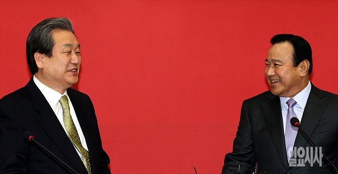 24일, 서울 여의도 국회 새누리당 김무성 대표(사진 왼쪽)를 예방한 이완구 국무총리가 김 대표와 환담을 나누고 있다.