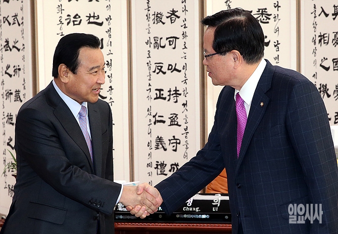 24일, 서울 여의도 국회 정의화 의장(사진 오른쪽)을 예방한 이완구 국무총리가 악수를 나누고 있다.