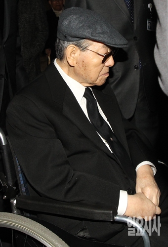 25일 오전 서울 송파구 서울아산병원 장례식장에서 거행된 김종필 전 총리의 부인 故 박영옥 여사 발인식에서 김 전 총리가 슬픔에 잠겨있다. 척추협착증과 요도암 투병 끝에 지난 21일 86세로 세상을 떠난 고인은 충남 부여에 위치한 가족 묘소에 안장된다.