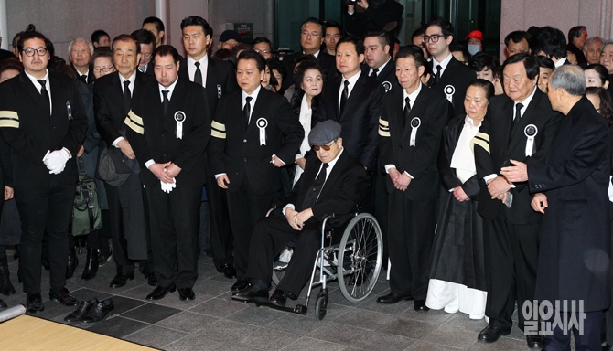 25일 오전 서울 송파구 서울아산병원 장례식장에서 거행된 김종필 전 총리의 부인 故 박영옥 여사 발인식에서 김 전 총리와 유가족들이 고인의 마지막 길을 지켜보고 있다. 척추협착증과 요도암 투병 끝에 지난 21일 86세로 세상을 떠난 고인은 충남 부여에 위치한 가족 묘소에 안장된다.