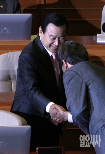 이완구 신임 국무총리가 제331회 국회(임시회) 본회의가 열린 25일 오전 서울 여의도 국회 본회의에 참석해 의원들과 인사를 나누고 있다.