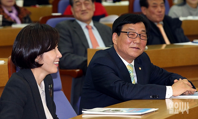 25일, 서울 여의도 국회 의원회관에서 새누리당 이종진 의원 주최로 열린 '요양보호사 복지수준향상 토론회' 도중 이종진 의원(사진 오른쪽)과 나경원 의원이 웃음 짓고 있다.