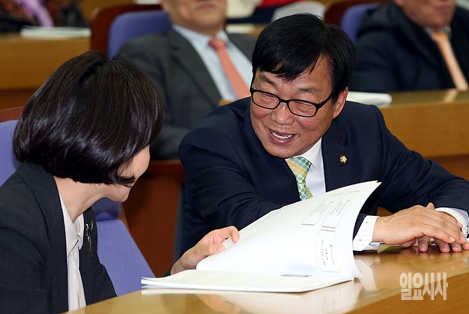 25일, 서울 여의도 국회 의원회관에서 새누리당 이종진 의원 주최로 열린 '요양보호사 복지수준향상 토론회' 도중 이종진 의원과 나경원 의원이 이야기를 나누고 있다.