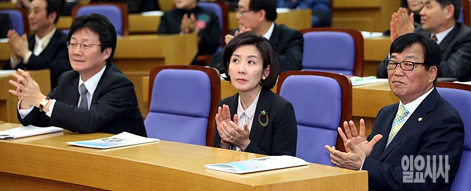 25일, 서울 여의도 국회 의원회관에서 새누리당 이종진 의원 주최로 열린 '요양보호사 복지수준향상 토론회'에서 유승민 원내대표(사진 왼쪽), 나경원 의원, 이종진 의원(사진 오른쪽)이 박수를 치고 있다.