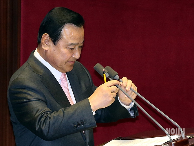25일, 서울 여의도 국회 본회의장에 열린 첫날 대정부질문에서 이완구 국무총리가 의원들의 질의를 받기 전, 마이크 높이를 조절하고 있다.