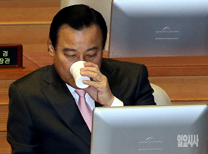 25일, 서울 여의도 국회 본회의장에 열린 첫날 대정부질문에서 이완구 국무총리가 목이 타는 듯 물을 마시고 있다.