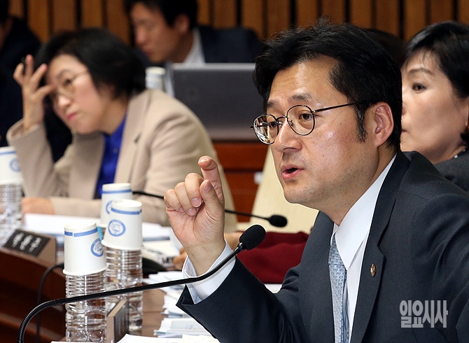 25일, 서울 여의도 국회에서 열린 '정부 및 공공기관 등 해외자원개발 진상규명국정조사특별위원회' 전체회의에서 홍익표 새정치민주연합 의원이 윤상직 산업자원부장관에게 질의를 하고 있다.