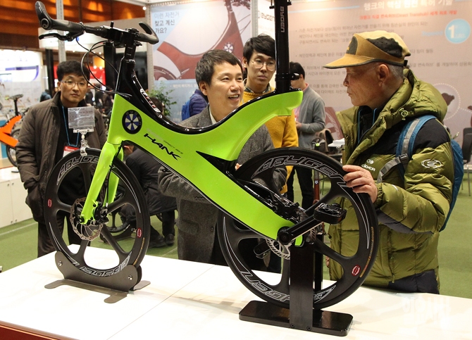 26일 오후 서울 강남구 코엑스에서 열린 '2015 서울국제스포츠레저산업전'에서 자전거 업체 '바이젠' 관계자가 참관객에게 상품을 소개하고 있다.