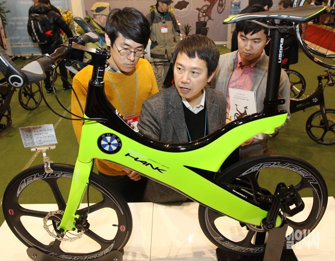 26일 오후 서울 강남구 코엑스에서 열린 '2015 서울국제스포츠레저산업전'에서 자전거 업체 '바이젠'의 관계자가 참관객들에게 상품을 소개하고 있다.