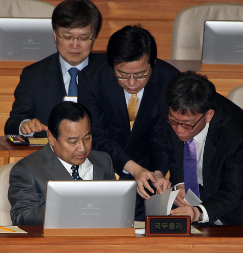 이완구 신임 국무총리가 26일 국회 본회의에서 열린 경제 분야 대정부질문에 참석해 관계자들과 자료를 검토하고 있다.