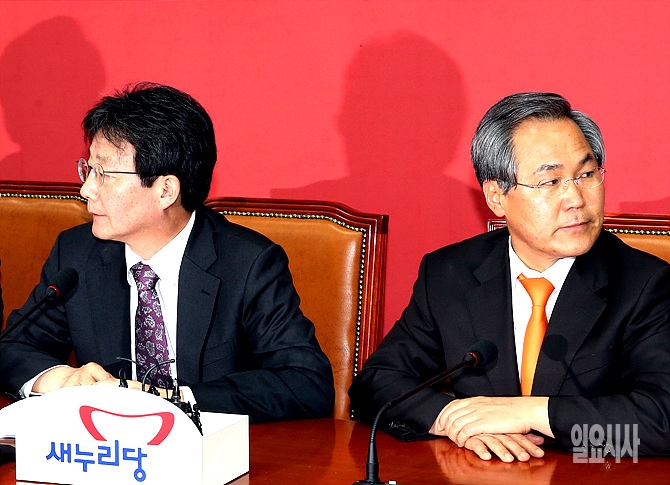 29일, 새누리당 유승민·새정치민주연합 우윤근 원내대표가 서울 여의도 국회 새누리당 원내대표실에서 열린 '2+2 회동' 도중 잠시 고개를 돌리고 있다.