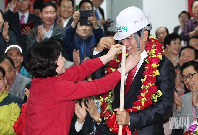 새누리당 서울 관악을 오신환 후보가 29일 오후 서울 관악구 오 후보의 선거사무소에서 국회의원 재보궐선거 당선을 확정짓자 한 지지자로부터 안전모와 빗자루를 선물받고 있다.