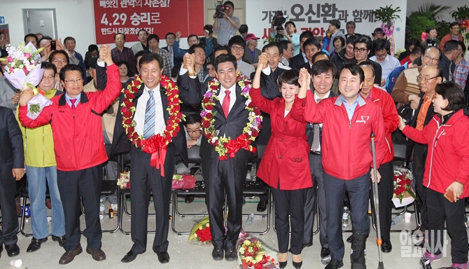새누리당 서울 관악을 오신환 후보가 29일 오후 서울 관악구 오 후보의 선거사무소에서 국회의원 재보궐선거 당선을 확정짓자 환호하고 있다.
