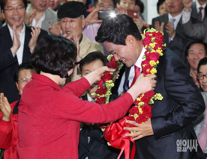 새누리당 서울 관악을 오신환 후보가 29일 오후 서울 관악구 오 후보의 선거사무소에서 국회의원 재보궐선거 당선을 확정짓자 꽃목걸이를 목에 걸고 있다.