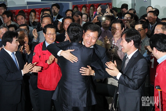 국회의원 재보궐 선거에서 당선을 확정지은 새누리당 서울 관악을 오신환 후보가 29일 오후 서울 관악구 자신의 선거사무소에서 오세훈 공동선거본부장과 포옹하고 있다.