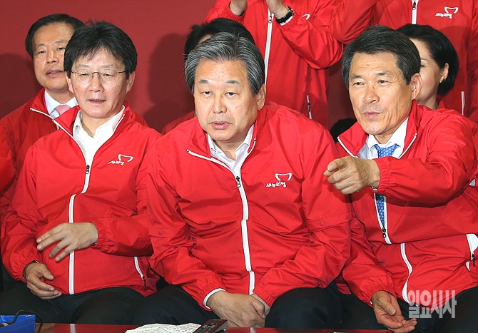 29일, 서울 여의도 새누리당 당사에서 4·28재보선 선거결과 방송을 지켜보던 이군현 사무총장이 김무성 대표에게 개표결과 모니터를 가리키고 있다.
