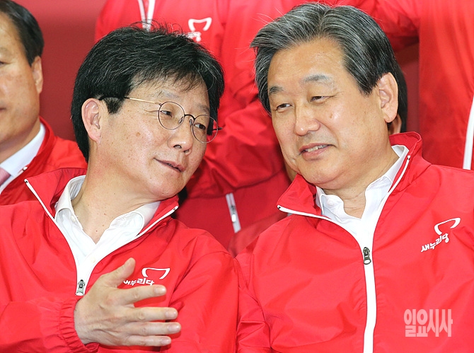 29일, 서울 여의도 새누리당 당사에서 4·28재보선 선거결과 방송을 지켜보던 유승민 원내대표가 김무성 대표에게 귓속말을 하고 있다.
