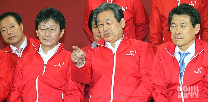 29일, 서울 여의도 새누리당 당사에서 4·28재보선 선거결과 방송을 지켜보던 김무성 대표가 선거 결과 모니터를 가리키고 있다.