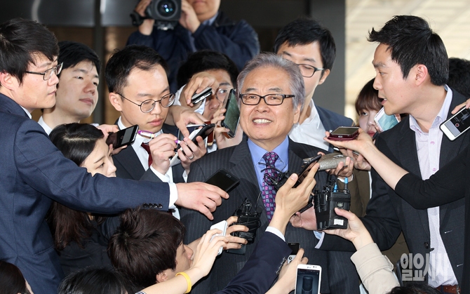 '중앙대 특혜' 외압 의혹을 받고 있는 박범훈 전 청와대 교육문화수석이 30일 오전 서초동 서울중앙지검에 피의자 신분으로 출석해 취재진의 질문을 받고 있다.