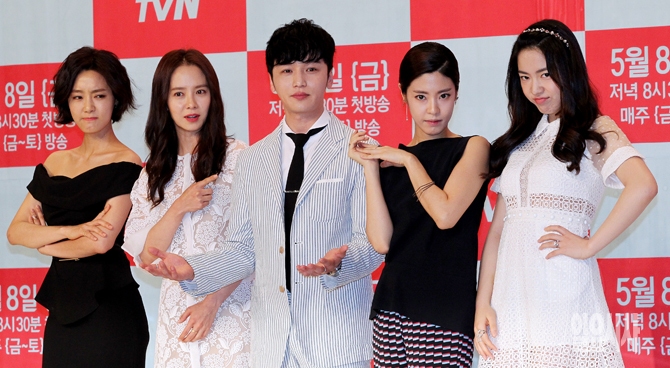 30일 오후 서울 영등포 타임스퀘어 아모리스홀에서 열린 TvN 금토 드라마 <구여친클럽> 제작발표회에서 출연진들이 포즈를 취하고 있다. 왼쪽부터 배우 장지은, 송지효, 변요한, 이윤지, 류화영.