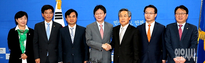 4일, 서울 여의도 국회에서 유승민·우윤근 여야 원내대표, 조해진·안규백 여야 원내수석부대표 등 지도부가 '2+2' 주례회동 직전, 악수를 나누고 있다.