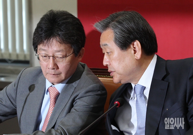 새누리당 김무성 대표(오른쪽)와 유승민 원내대표가 4일 오전 서울 여의도 국회에서 열린 최고위원회의에서 귀엣말을 나누고 있다.