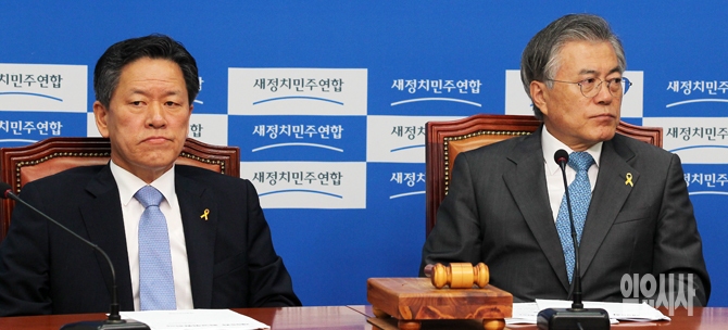 새정치민주연합 주승용 최고위원(왼쪽)과 문재인 대표가 4일 오전 서울 여의도 국회에서 열린 최고위원회의에 참석해 앉아있다. 주승용 의원은 이날 문 대표를 겨냥해 "선거 결과에 따라 책임지고 물러나지 않겠다면 패권정치를 청산하겠다는 약속을 하고 실천해야 한다"고 촉구했다.