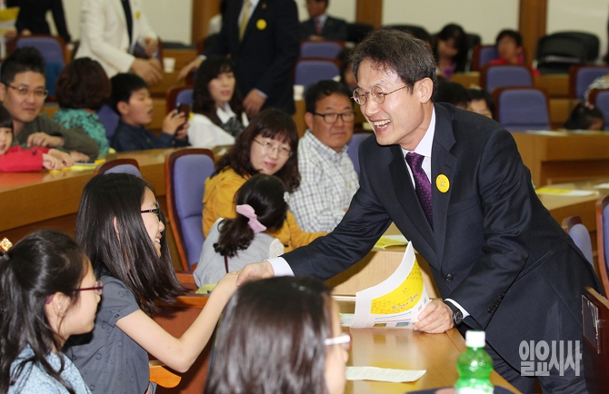 조희연 서울시교육감이 4일 오전 서울 여의도 국회의원회관에서 열린 '어린이 놀이헌장 선포식'에 참석해 초등생들과 인사를 나누고 있다.