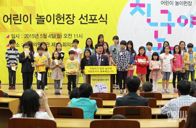어린이날을 하루 앞둔 4일 오전 전국 시·도교육감협의회 회장인 장휘국 광주시교육감이 서울 여의도 국회의원회관에서 '어린이 놀이 헌장'을 선포하고 있다.