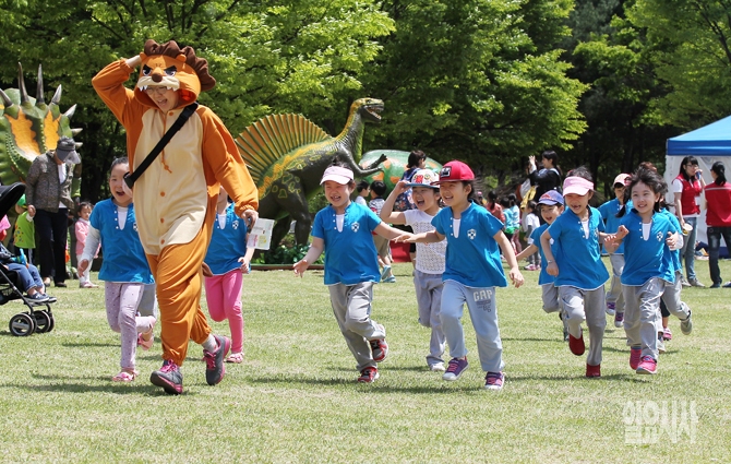 어린이날을 하루 앞둔 4일 오후 서울 마포구 난지천공원 난지잔디광장에서 열린 '2015 마포어린이대축제-마포둥이 모여라'에서 신덕 어린이집 어린이들이 뛰어놀고 있다.