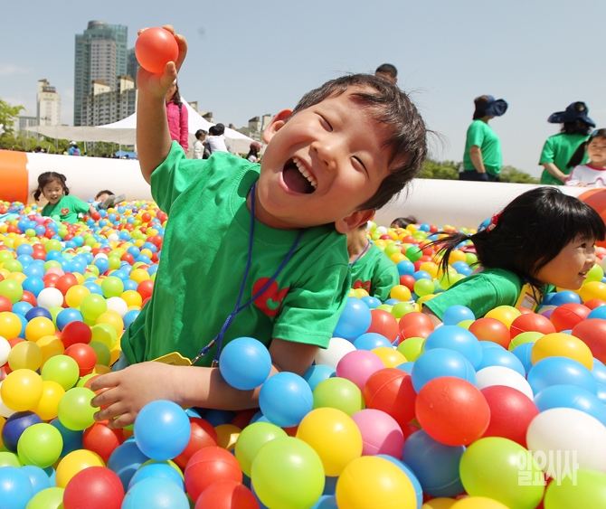 어린이날을 하루 앞둔 4일 오후 서울 마포구 난지천공원 난지잔디광장에서 열린 '2015 마포어린이대축제-마포둥이 모여라'에서 어린이들이 놀고 있다.