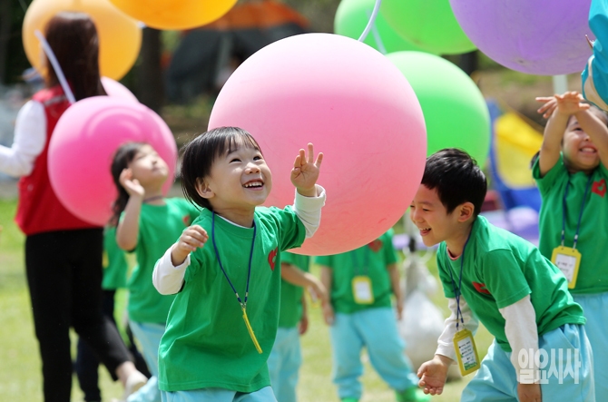 어린이날을 하루 앞둔 4일 오후 서울 마포구 난지천공원 난지잔디광장에서 열린 '2015 마포어린이대축제-마포둥이 모여라'에서 어린이들이 뛰어놀고 있다.