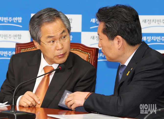 새정치민주연합 우윤근 원내대표(왼쪽)와 정청래 최고위원이 6일 오전 서울 여의도 국회에서 열린 최고위원회의에서 대화를 나누고 있다.