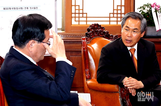 6일, 서울 여의도 국회 국회의장 집무실에서 정의화 국회의장과 새정치민주연합 우윤근 원내대표가 '박상옥 대법관 후보자에 대한 의장의 직권상정 문제'로 이야기를 나누고 있다.