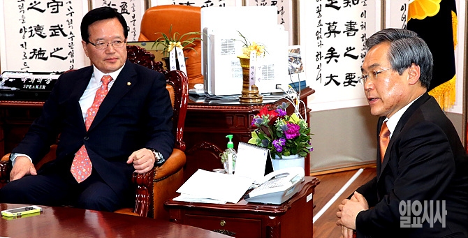 6일, 서울 여의도 국회 국회의장 집무실에서 정의화 국회의장과 새정치민주연합 우윤근 원내대표가 '박상옥 대법관 후보자에 대한 직권상정 문제'로 이야기를 나누고 있다.