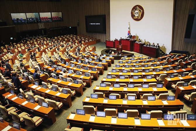 본회의장 오른쪽의 야당 의원들은 직권상정에 불만을 표시해 모두 퇴장해 여당 단독으로 표결이 이뤄졌다.